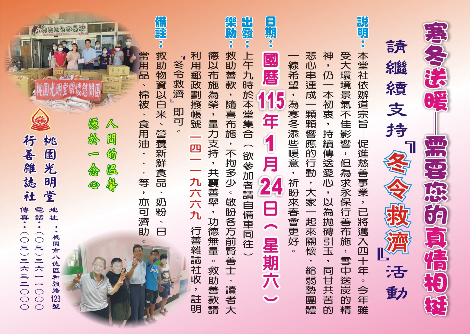 本堂社依辦道宗旨--促進慈善事業,已邁入四十年。今年雖受大環境景氣不佳影響,但為求永保行善布施,雪中送炭的精神,仍一本初衷,持續傳送愛心,以位拋磚引玉,同甘共苦的悲心串連成一顆顆響應的行動,大家一起來關懷,給弱勢團體一線希望,為寒冬添些暖意,期盼來春會更好。